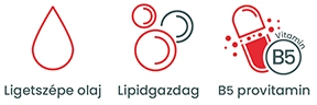 A hozzáadott hipoallergén gyapjúzsír miközben védi a bőrt a további kiszáradástól, a bőr mélyebb rétegeiben kifejtett hatásával. A ricinus- és napraforgóolaj pedig még inkább puhítja és táplálja a bőrt. A dexpanthenol, vagyis a B5-provitamin, támogatja a bőr regenerációját, segíti a sebgyógyulást. Hidratáló tulajdonságai révén csökkenti az irritációt, miközben erősíti a bőr természetes védőrétegét.